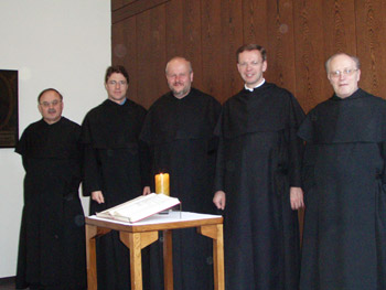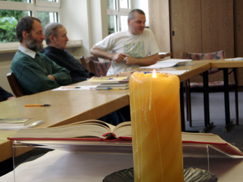 Evangeliar und Kerze, im Hintergrund fr. Philippe M., fr. Oszkar M. und fr. Fero M. (v.l.)