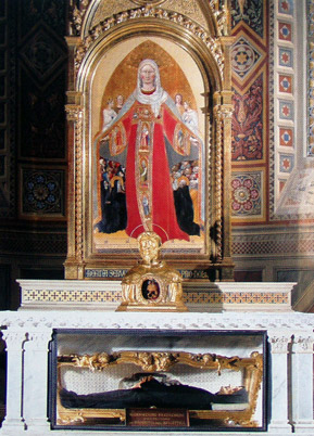 Sein Leben war ein Zeugnis tiefer Demut. Er suchte die einfachsten Arbeiten und die am wenigsten begehrten Aufgaben. Seine mitleidende Liebe galt besonders den Betrübten, und den Kranken leistete er jene Dienste, vor denen andere zurückschreckten. Seine Liebe zum Gehorsam zeigt sich in seiner Überzeugung: "Der Gehorsam ist die Nahrung meiner Seele. Sagt doch unser Herr Jesus: Meine Nahrung ist es, den Willen des Vaters zu tun (Joh 4,43)". In Begleitung seines Mitbruders Aquisto mußte Joachim auf dem Weg nach Arezzo vor der hereinbrechenden Nacht wegen eines heftigen Regens in einem Hospiz Zuflucht nehmen. Dort begegneten sie einem Epileptiker, der seit langem an heftigen Anfällen litt. Als Joachim ihn mit dem Hinweis aufmuntern wollte, dass ihm sein geduldig ertragenes Leid Weg zum Himmel sein könnte, gab dieser zur Antwort: "Bruder, es ist leichter die Krankheit zu loben, als sie zu ertragen", worauf Joachim meinte: "Ich werde den allmächtigen Gott bitten, dass er dich von diesem Übel befreie und es mir, seinem Diener, bis zum Tode auferlege. Damit ich allzeit an meinem Leib die Leiden Christi trage." Die Erhörung der Bitte folgte auf dem Fuß; der Kranke wurde geheilt und der heilige Bruder von der Epilepsie befallen. An dieser litt er sein Leben lang. Damit erwarb er sich gleichsam eine Märtyrerkrone. Am Karfreitag 1305 starb er. Am Vorabend seines Todes bat er seine Mitbrüder um Verzeihung und ersuchte den Prior um ein Glas Wein für alle als Zeichen der Liebe und Verbundenheit untereinander. Bei den Worten der Leidensgeschichte "Vater, in deine Hände empfehle ich meinen Geist", gab Joachim wie Christus, der Gekreuzigte, der die Leiden anderer auf sich genommen hatte, seine Seele an Gott zurück. Papst Paul V. bestätigte 1609 seine Verehrung, gewährte dem Orden Messe und Offizium des Seligen und ließ seinen Namen in das Martyrologium der Kirche eintragen. Seine Gebeine ruhen in der Servitenkirche von Siena (s. Foto rechts). Viele Mütter kommen mit ihren Kindern zu seiner Grabstätte, um den Segen des Seligen zu erbitten.